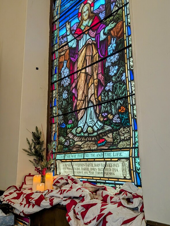 If you are unable to be with us in-person during the season of Advent and Christmas, we would like to share some images from the beautiful quilts that have been shared by members of this faith family, as well as the how the sanctuary and Heritage Room have been decorated. Following the Sanctified Arts resource of 'Words for the Beginning', six of the beautiful artist images were printed and mounted and are displayed in the sanctuary, and the logo hangs from the pulpit.